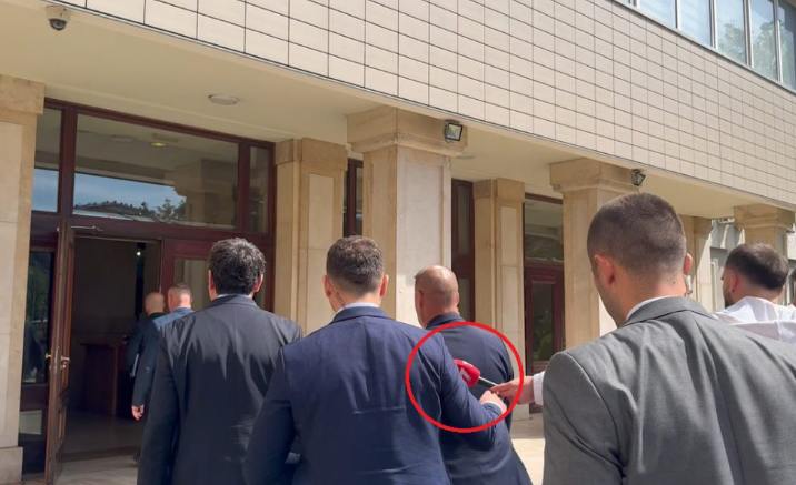 Njëri nga truprojat e tij është parë duke ia shtyrë mikrofonin një gazetari.