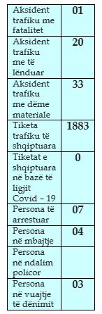 Gjatë kësaj periudhe janë shqiptuar 1 mijë e 883 gjoba trafiku, janë arrestuar shtatë persona dhe katër janë dërguar në mbajtje.