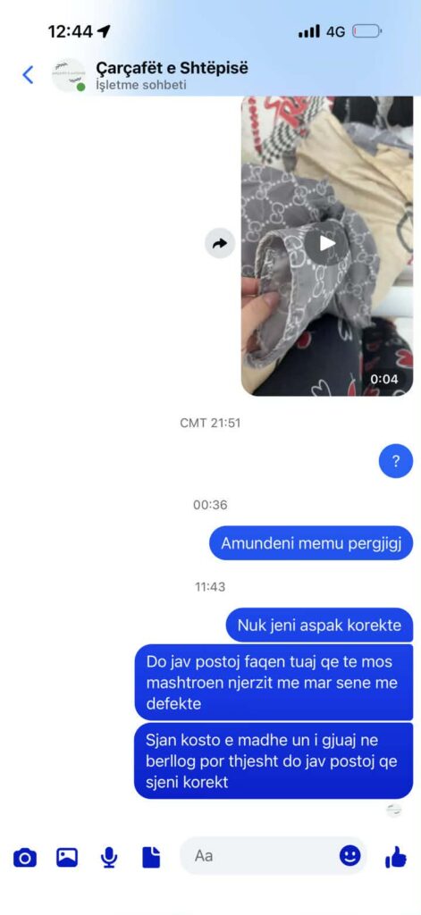 Një kliente ka konfirmuar për redaksinë se produktet e porositura i kanë mbërritur me defekte të dukshme. Sipas dokumentimit që disponon redaksia – përfshirë fotografi dhe komunikim të plotë – pasi ka kërkuar zëvendësim apo sqarim për cilësinë e mallit, ajo është bllokuar nga faqja.
