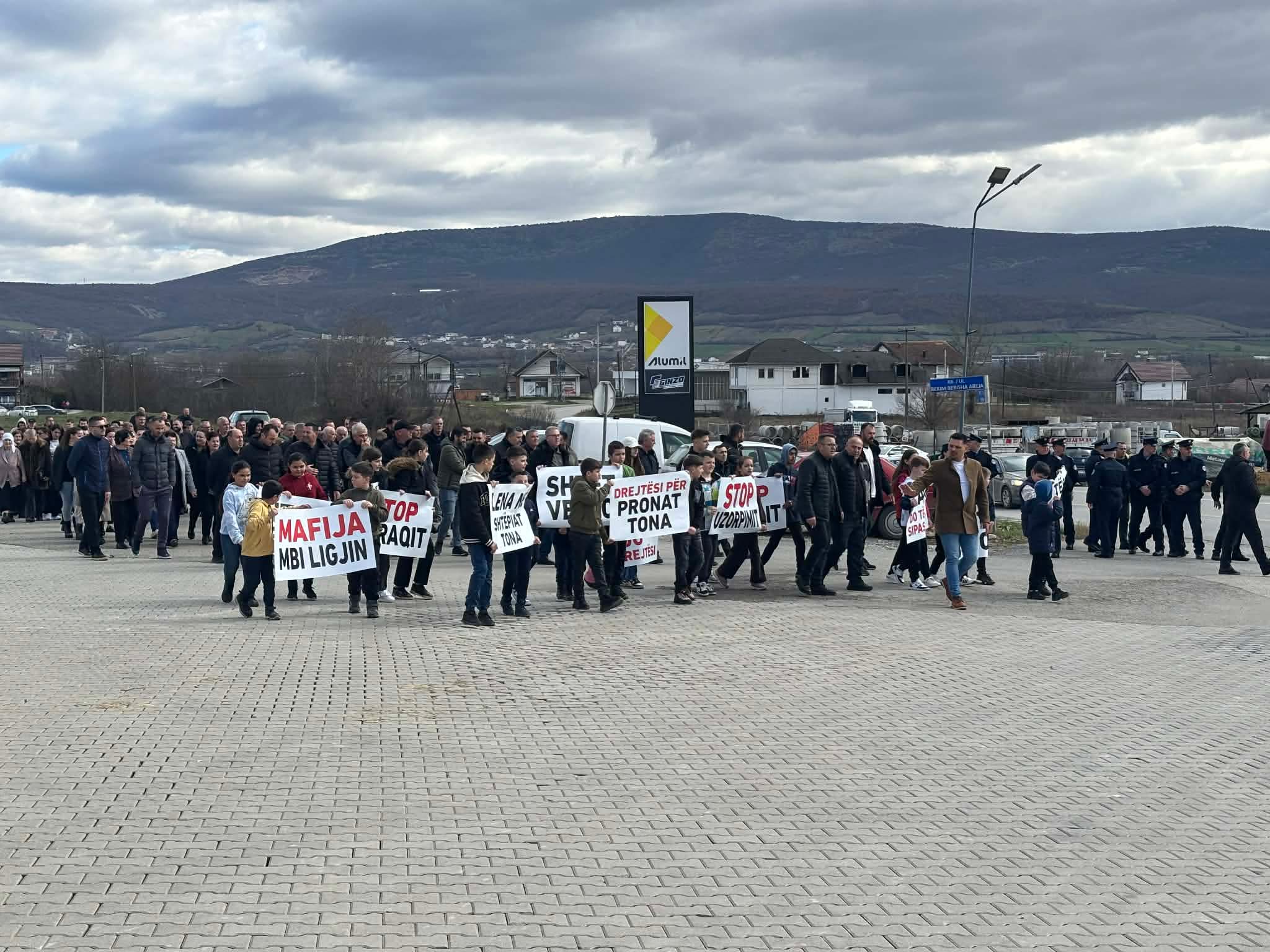 Në protestë kanë marrë pjesë familjarë të shumtë të zonës, përfshirë gra dhe fëmijë.