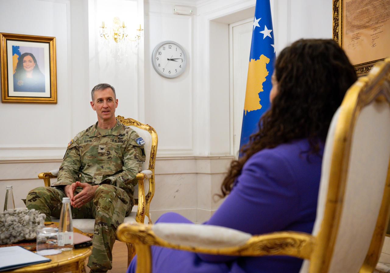 Presidentja e Republikës së Kosovës, Vjosa Osmani, ka pritur në takim lamtumirës komandantin në largim të Komandës Rajonale Lindje të KFOR, kolonelin Jonathan Lloyd nga Garda Kombëtare e Louisianës, si dhe pasuesin e tij, kolonelin Sam Sargeant.